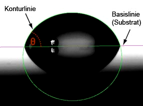 For this purpose, a drop of test fluid is deposited on the surface to be tested. The lying drops are recorded using a camera. Special software measures the contour of the droplet and the base line of the substrate from the image. The figure shows the determined contour in green and the base line in red.