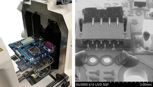 Das Großkammer-REM Hitachi SU3900 erlaubt die Analyse auch großer und schwerer Proben, die für die Analyse nicht zerteilt werden sollen, wie etwa elektrischer Platinen oder größerer und schwerer Werkstücke bis 30 cm Durchmesser, 13 cm Höhe und 5 kg Gewicht. Elektrisch nichtleitende Proben müssen dabei durch die Möglichkeit, das Probenkammer-Vakuum nach Bedarf zu variieren, für die Analyse nicht beschichtet werden. Dies erlaubt so die weitere Verwendung des Testobjekts nach der REM-Analyse.