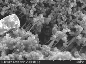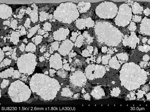 Für anspruchsvollere Anwendungen, die das Abbilden und Analysieren feinster Details selbst auf empfindlichen Probenmaterialien erfordern, steht das Feldemissions-REM Hitachi SU8230 bereit. Exemplarisch für dessen Leistungsfähigkeit zeigt das nebenstehende Foto carbon-black Partikel und feinste Polymer-Binder-Fäden im Nanometerbereich auf der NCM-Kathode einer Lithium-Ionen-Batterie.