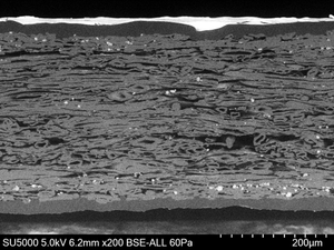 Einblick in die inneren Strukturen von komplexen Schichtsystemen (dünne Filme und Lacksysteme, galvanische Beschichtungen, Papier, Batteriefolien, Halbleiter, Kompositmaterialien etc.) gewinnt die Rasterelektronenmikroskopie in Verbindung mit unserem Argon-Ionenstrahl-Querschnittspolierer(Hitachi IM5000), der hochqualitative Querschnitte bis zu 10 mm Breite und mit ca. ~15 µm Positionsgenauigkeit selbst durch inhomogene Materialien ermöglicht, die für klassische Präparationstechniken nicht zugänglich sind.