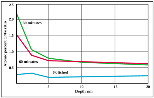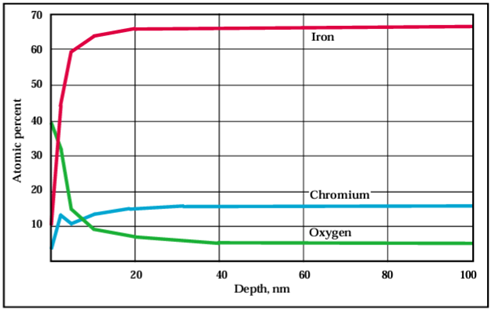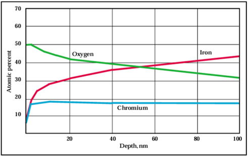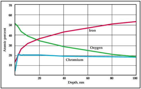 Die XPS (X-ray Photoelectron Spectroscopy) ermöglicht eine Oberflächenanalyse von Edelstahl-Oberflächen im Bereich (Informationstiefe der XPS) von 2–10 nm. Durch Sputter-Tiefenprofilmessungen sind auch größere Tiefen der Analyse zugänglich, um die Passiviereungsschicht auf dem Stahl untersuchen zu können.